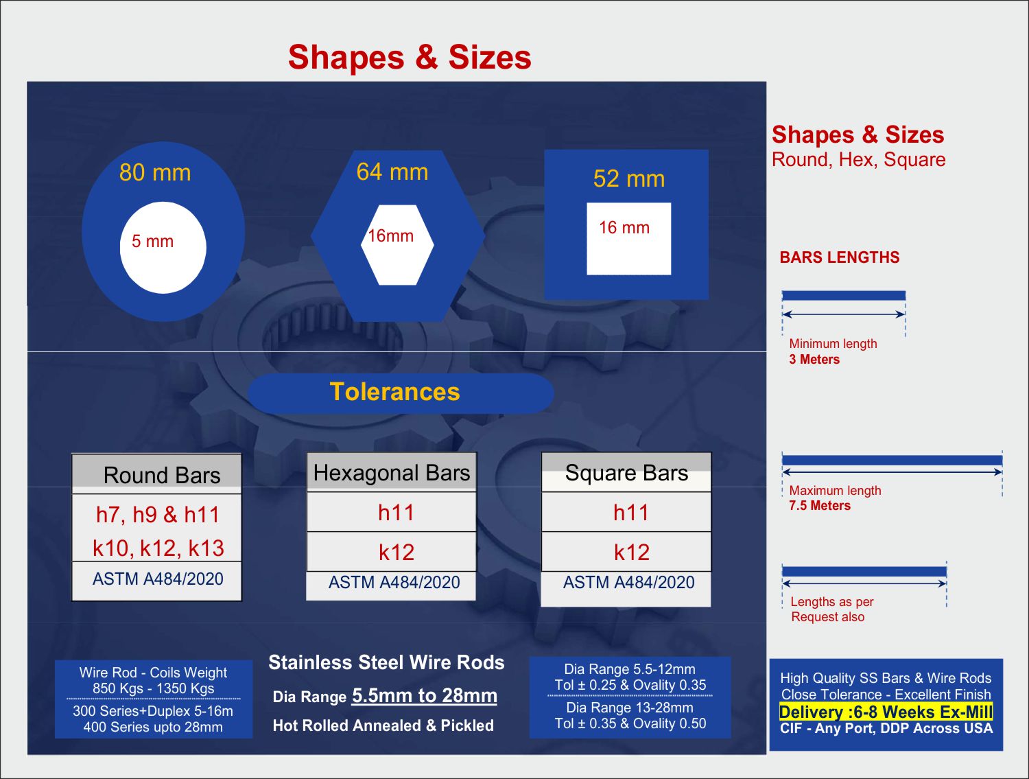 Our supplied materials are being used by leading industries (Petrochemicals, Oil & Gas, LNG, Marine, Heavy Equipment, Automotives, Fasteners & Wires, Pharma & Medical, Shaft Manufacturers, Nuclear Power & Energy, Aerospace & Defense, Shipbuilding etc etc.)